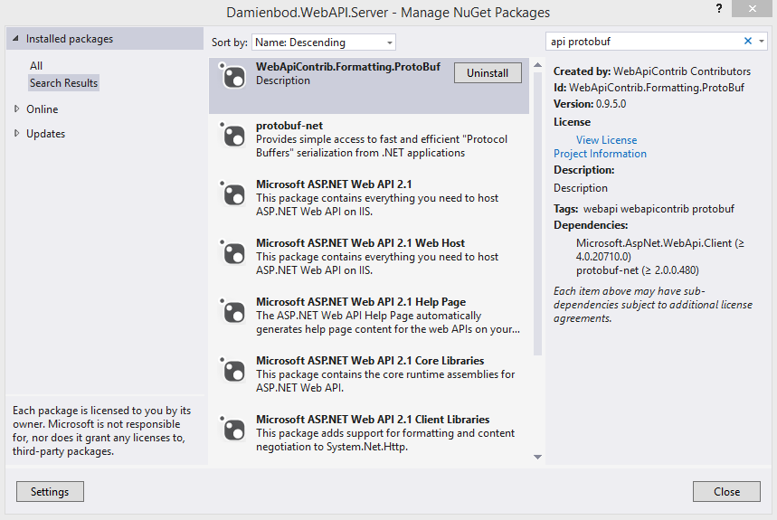 To use Protobuf for the batch service, add the webcontrib Protobuf NuGet package to the project.