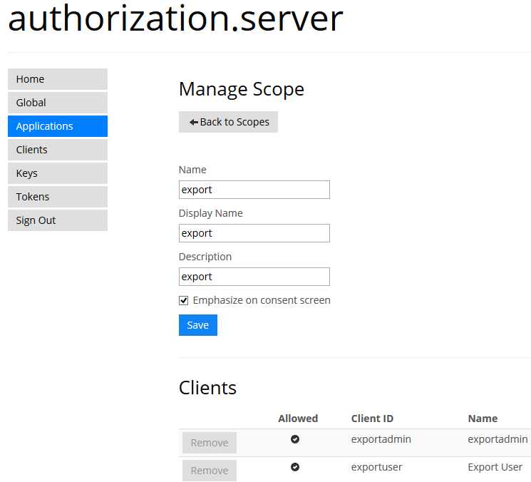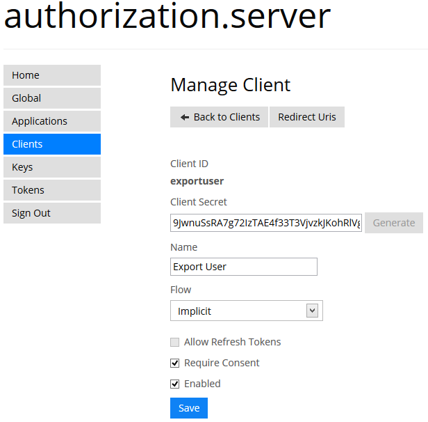 A client configuration is then required for the exportuser. The exportuser needs to be defined and also the callback URL for this client: