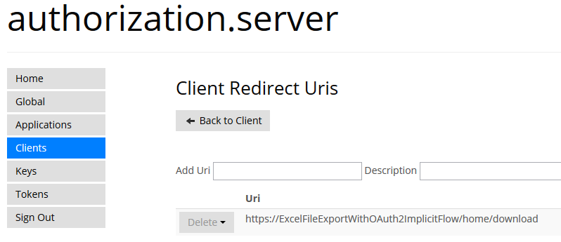 The resource server is a simple MVC application which hosts a Web API 2 service. The api has one single method for exporting excel data. This export uses the WebApiContrib.Formatting.Xlsx library from Jordan Gray. The api method forces that excel is always returned no matter what is set in the Accept Header. This is not usually good practice as the client should decide in which format the data should be returned. I have forced this, so that it’s easy to use in the browser.