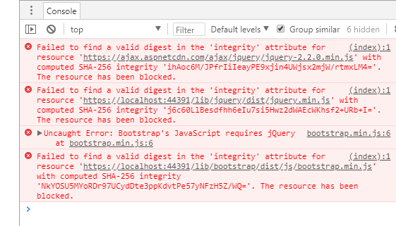 To test this, you can change the value of the integrity parameter on the script, and in the production environment, the script will not load and fallback to the localhost deployed script. By changing the value of the integrity parameter, it simulates a changed script on the CDN. The following snapshot shows an example of the possible errors sent to the browser: