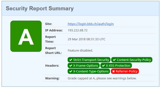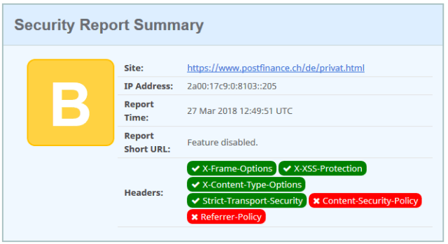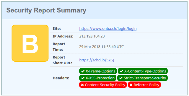 The website is an A-Grade, but missing 2 headers, the X-Frame-Options and the no-referrer header. The e-banking is less protected compared to the website, has a grade B. It is missing the CSP and the referrer policy.