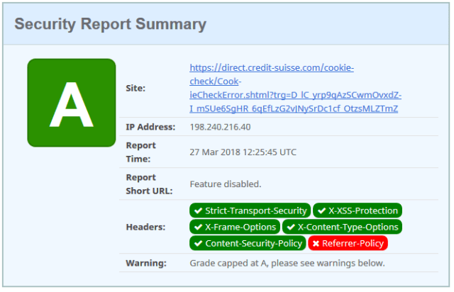 The Credit Suisse website and login are protected with most of the headers and have a good CSP. The no-referrer header is missing from the e-banking login and could be added.