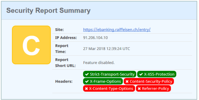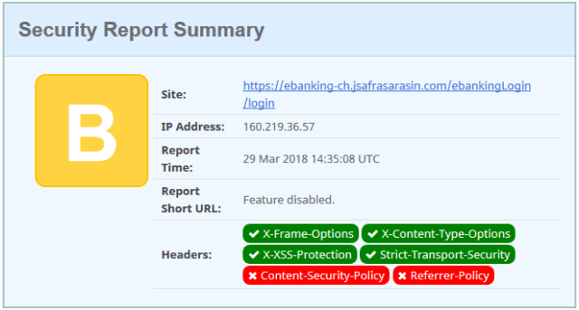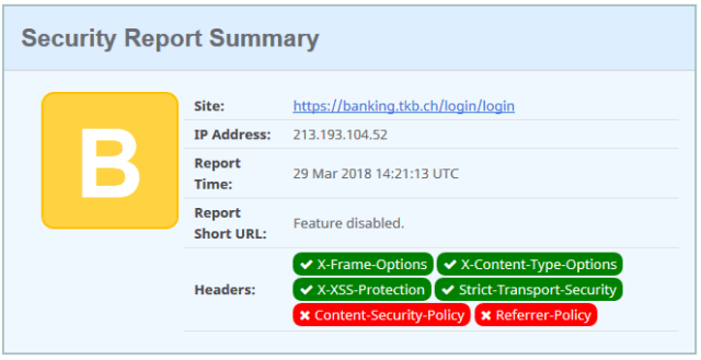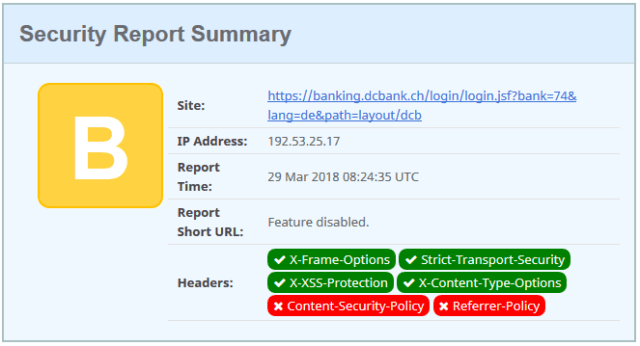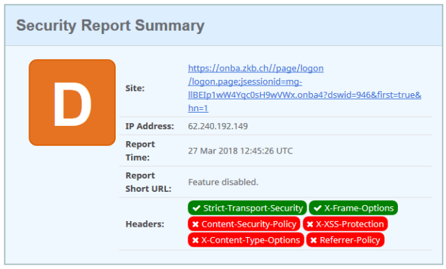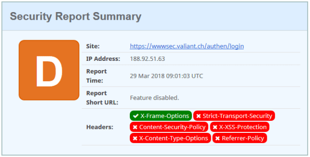 The headers returned from the e-banking login is even worst than the D rating, as it is also missing the X-Frame-options protection.