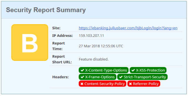 This is an interesting test. Basler Kantonalbank has a no security headers in the website, and even an incorrect X-Frame-Options. The e-banking is good, but missing the no-referrer policy. So it has the best and the worst of the banks tested.