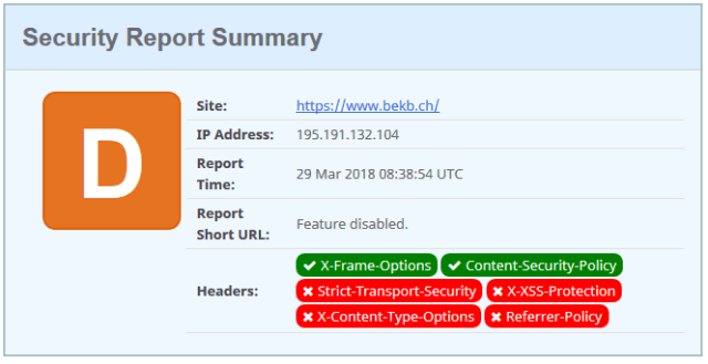 The Berner Kantonalbank has implemented 2 security headers on the website , but is missing the HSTS header. The e-banking is missing 2 of the security headers, no-referrer policy and the CSP.