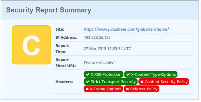 Julius Bär is missing the CSP header and the no-referrer header for the e-banking login, and the X-Frame-Options is also missing from the website.