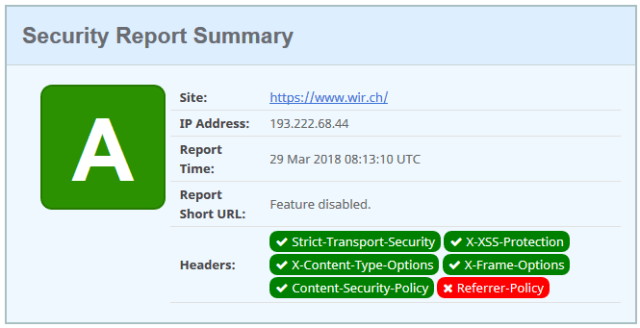 The WIR bank have one of the best websites, and is missing the the no-referrer header. It’s e-banking solution is missing both a CSP Header as well as a referrer policy. Here the website is more secure than the e-banking, strange.