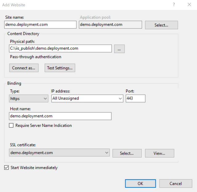 Now create the website in the IIS manager with the HTTPS set. The Microsoft docs describes this well: