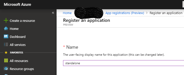 To connect from a non Azure application, an Azure AD Application Registration needs to be added. Click Azure Active Directory, and then in the new blade App registrations (Preview). This will probably be renamed soon. Click the New registration.