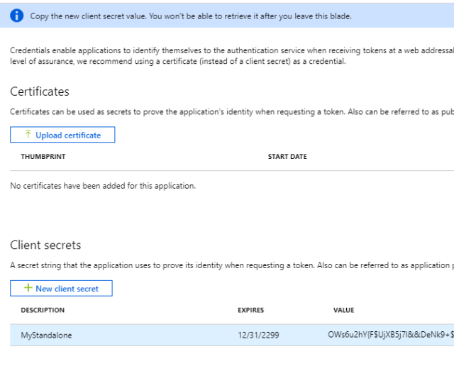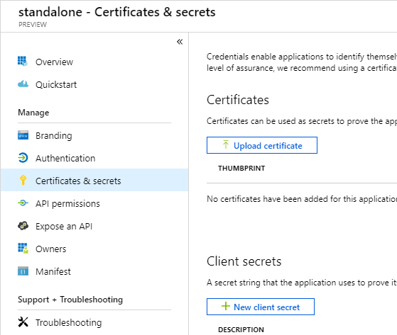 Now a secret for the AAD Application registration needs to be created. Click the Certificates & secrets button, and then New client secret.