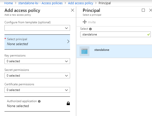 Select the AAD Application registration principle which was created before. You can find this, by entering the name. In this example, it was called standalone. Then give it the required permissions and save.