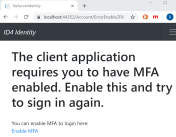 If MFA is required, and the user in ASP.NET Core Identity has 2FA enabled, then the login continues. If the user has no 2FA enabled, the user is redirected to the custom view ErrorEnable2FA.cshtml. Then ASP.NET Core Identity signs the user in.