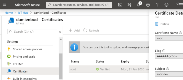 […] some searching I stumbled across CREATING CERTIFICATES FOR X.509 SECURITY IN AZURE IOT HUB USING .NET CORE by Damien Bod which showed how to generate certificates for Azure IoT Hub solutions using his NuGet […]