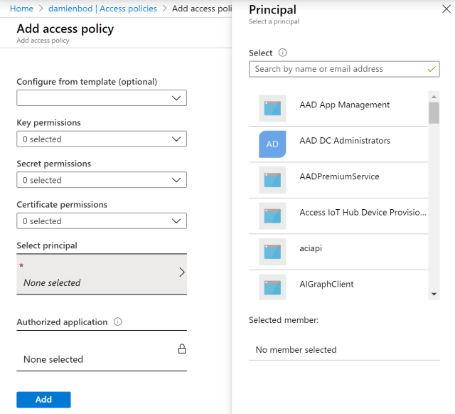 Open the Access Policies in the Key Vault and add a new one. Choose the principle used in the DevOps build.