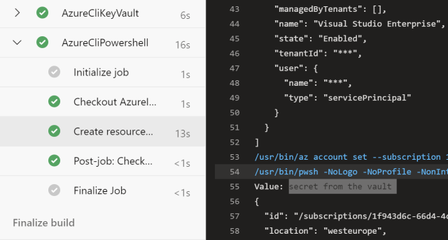 The Key Vault is displayed in the build Pipeline, like defined in the script. (Of course you would not normally print the secret in the console…)