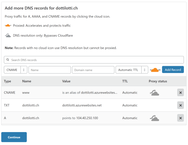When you have entered to correct values, then make sure you bypass the Cloudflare. This is required to add the custom domains to the Azure App service. The proxy status must be grey.