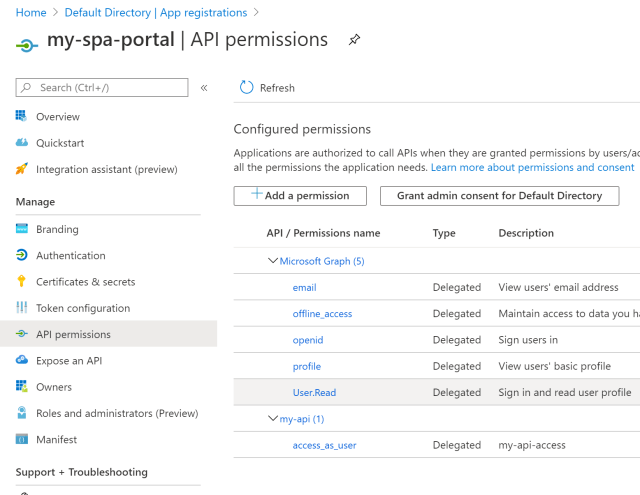 Add the API permissions which are required for the UI and the API requests. The Web API which was created in the previous blog needs to be added here, so that the SPA application can access the API which is protected by Azure AD.