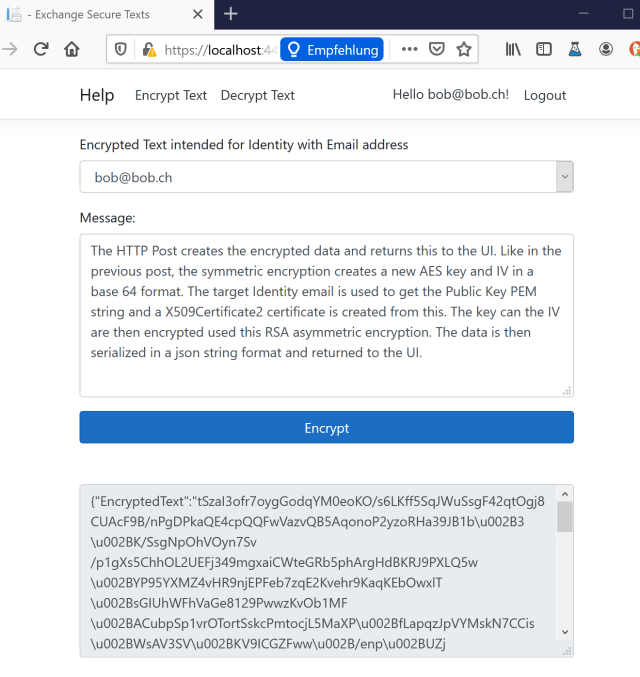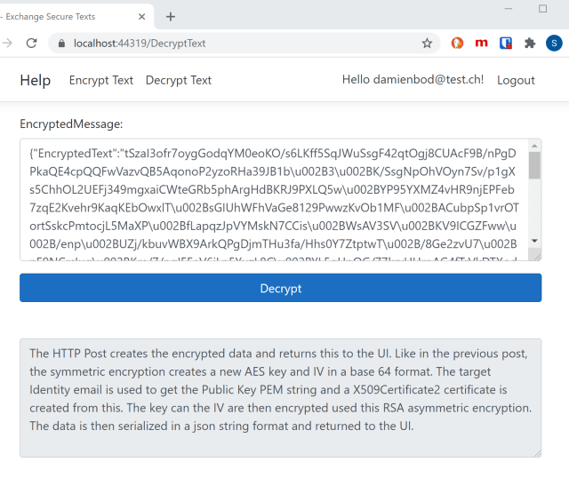 The HTTP Post creates the encrypted data and returns this to the UI. Like in the previous post, the symmetric encryption creates a new AES key and IV in a base 64 format. The target Identity email is used to get the public Key PEM string and a X509Certificate2 certificate is created from this. The key and the IV are then encrypted using this RSA asymmetric encryption. The data is then serialized in a Json string format and returned to the UI.