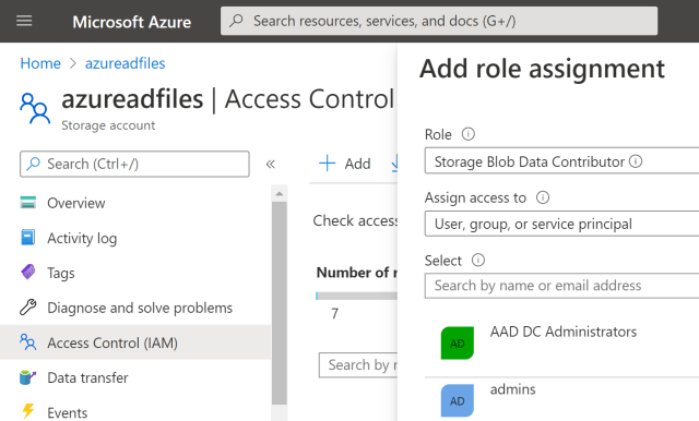 Add new role assignments for the admin user, yourself and all the users or groups that will upload or download blobs (files) to the storage container. The role “Storage Blob Data Contributor” is used for what we require.