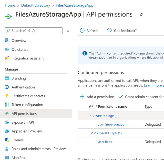 In the API permissions, the delegated access to the Azure storage is added. Add a permission and select the delegated user_impersonation access from the Azure storage.