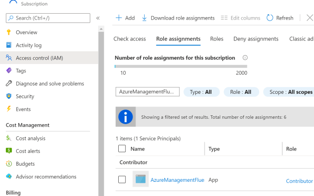 In the subscription, the Access control (IAM) blade is selected and a role assignment was added for the Azure Enterprise application which was created when we created the Azure App registration for this subscription. If the application registration is only required for the specific storage blob container, less rights would be required.