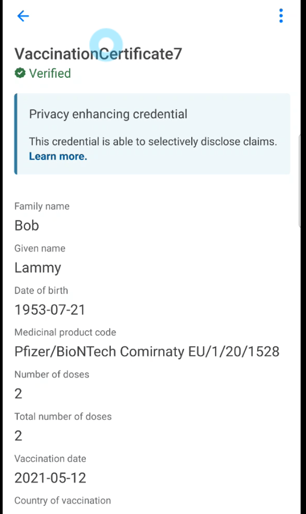 In the digital wallet, the verification request for the vaccination data can be viewed and if ok sent. The digital wallet displays the data which is disclosed and the data which is not. When the user clicks send, the data is validated and the API from the verifier application is called.