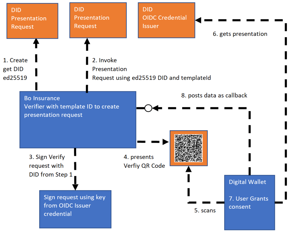 Verifying is very similar to the blog Present and Verify Verifiable Credentials in ASP.NET Core using Decentralized Identities and MATTR. A new DID of type ed25519 is used to invoke a verify request and also sign the request. The verifying flow in the application presents a QR Code using the redirectURL technic because the signed request is too long to present as a QR Code. This request returns a 302 with the full jws.