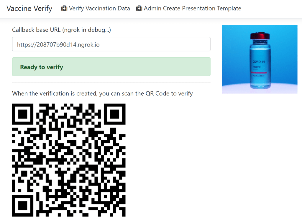 The application needs to be started using a public domain because the digital wallet will request back to the API with the data. I use ngrok to test locally. The verifier application can be started and the verify process is started by clicking the verify button which displays the QR Code to verify.