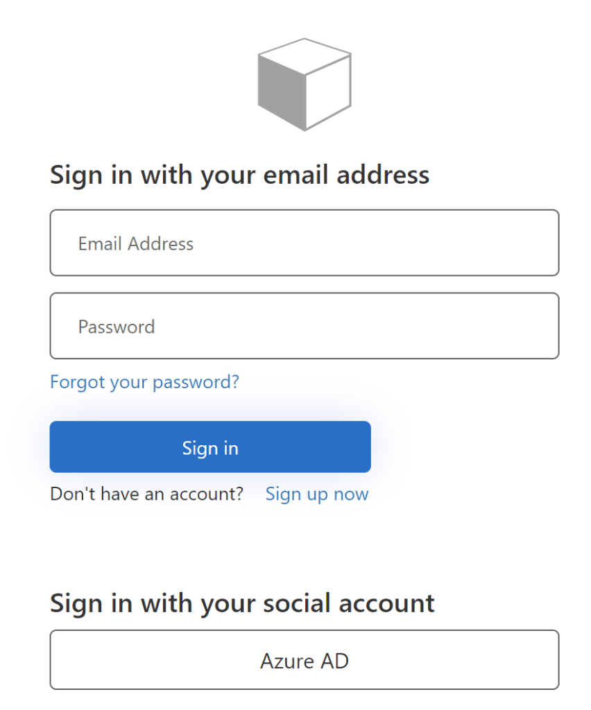 When the application is run, the Azure B2C user flow is used to authenticate and internal or external users can sign-in, sign-up. This view can be customized to match your styles.