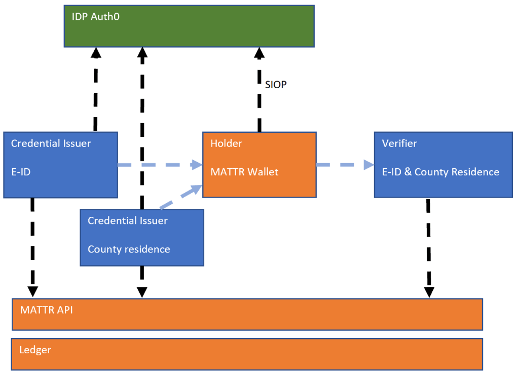 The solution is setup to issue and verify the BBS+ verifiable credentials. The credential issuers are implemented in ASP.NET Core as well as the verifiable credential verifier. One credential issuer implements a BBS+ JSON-LD E-ID verifiable credential using SIOP together with Auth0 as the identity provider and the MATTR API which implements the access to the ledger and implements the logic for creating and verifying the verifiable credential and implementing the SSI specifications. The second credential issuer implements a county of residence BBS+ verifiable credential issuer like the first one. The ASP.NET Core verifier project uses a BBS+ verify presentation to verify that a user has the correct E-ID credentials and the county residence verifiable credentials in one request. This is presented as a compound proof using credential subject data from both verifiable credentials. The credentials are presented from the MATTR wallet to the ASP.NET Core verifier application.