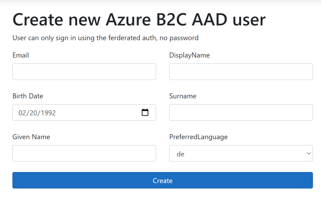 When the application is started, you can signin as an IT admin and create new users as required. The Birthday can only be added if you have an SPO license. If the user exists in the AAD tenant, the user can signin using the federated identity provider. This could be improved by adding a search of the users in the target tenant and only allowing existing users.