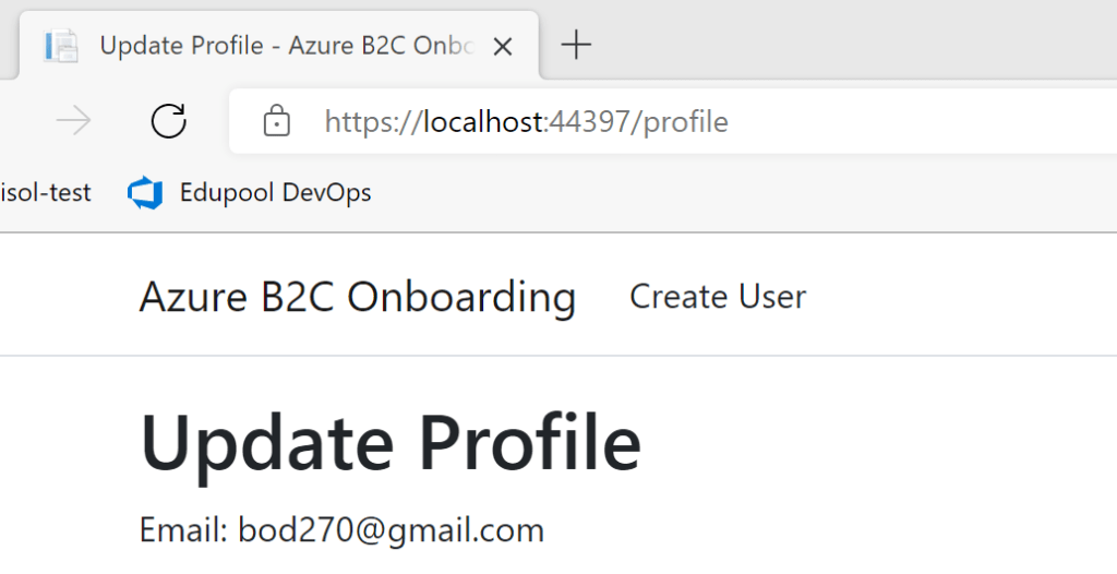 The profile page allows the user to update data which is controlled by the user. I do this in the application and do not user the Azure B2C profile because this is application specific. This is sensitive data and needs to be handled correctly. I display the OID, IsActive and the email here, but this data must not be updated in the profile page. This user data can only be managed by an application administrator. I also create and new user profile for a user, if the user does not exist but already has an Azure B2C account. This account can signin but will see nothing as the identity has no authorization to view anything. The authorization is set by an application administrator. By allowed this, existing Azure B2C accounts can be onboarded as well.