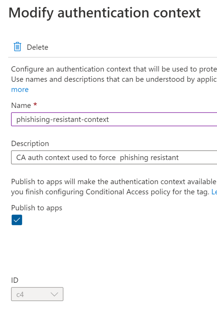Add the naming of the policy and the authentication context identifier. I used c4 for my phishing resistant requirement.