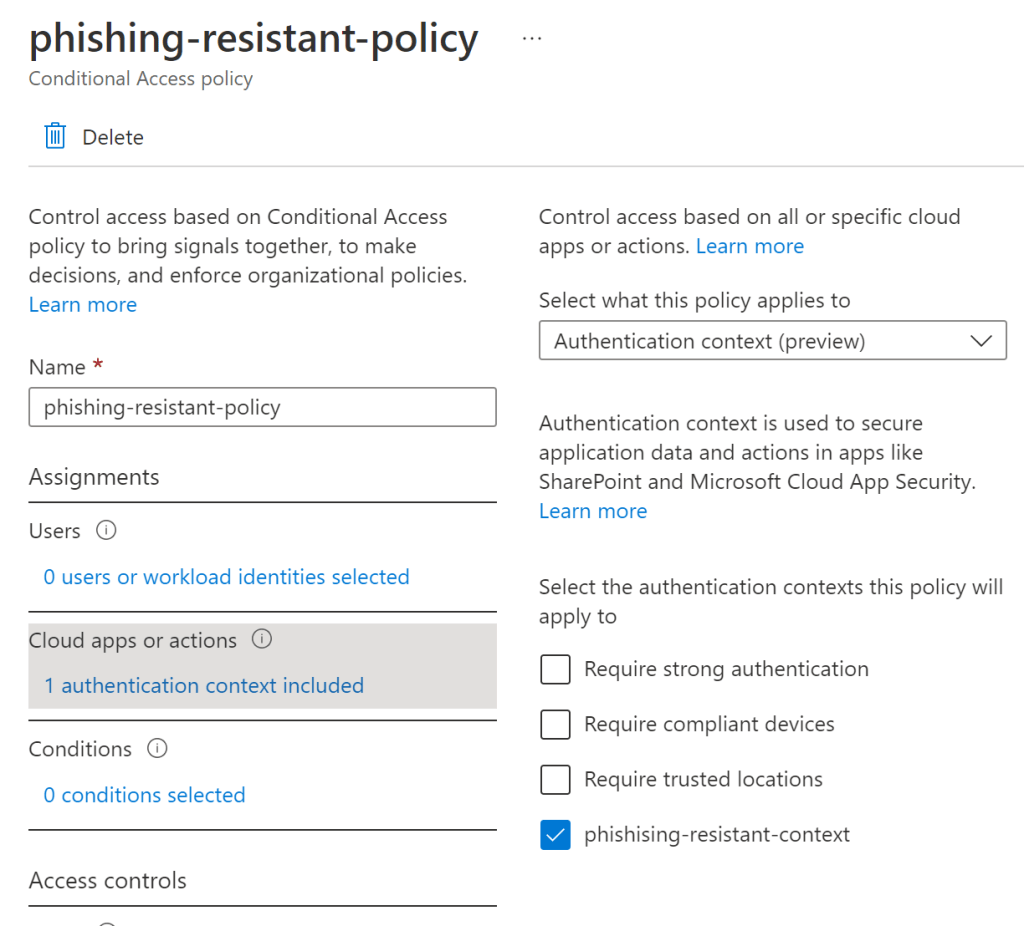 Select the created authentication context in the Cloud apps or actions.