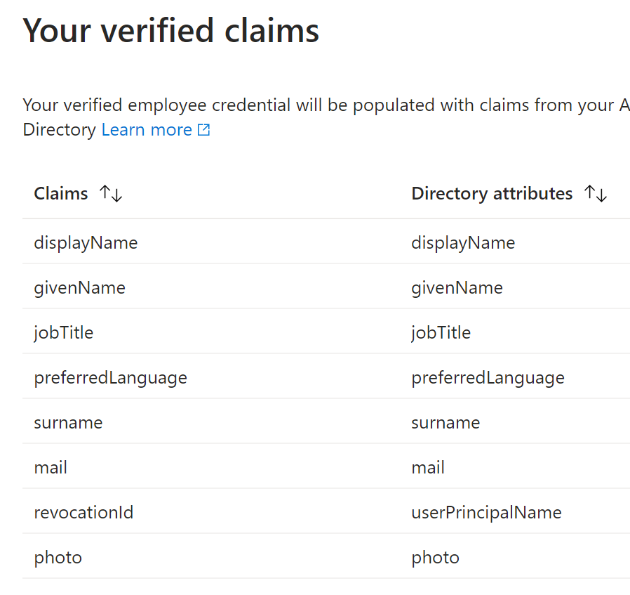 The Verified employee credential has eight fixed claim types. The UPN is used for the revocationId. Most of these claims can be set without problem, although the photo and the preferredLanguage requires some extra logic to set for the different Azure AD user accounts depending on what Microsoft licenses the company has. You can also use any user account data source to produce the verifiable credential, it does not need to be an Azure AD user account.