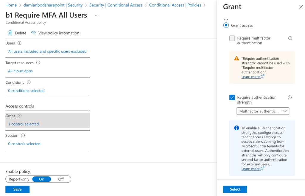 If a user account has a high or medium level possibility that it has been compromised, the user is required to do a multi-factor authentication. Why not Self-service password reset (SSPR)? I don’t really see the point of this if you are using passwordless sign-ins. Without a SSPR for a user with a password, the user-risk is not reset and the user will be forced to MFA again. I am not sure how this policy works with passwordless or phishing resistant authentication flows. This policy only makes sense with the high threat category and the block user. This requires a P2 license for users accounts.