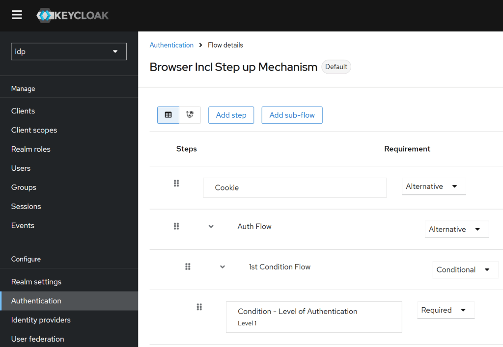 The client browser flow must be changed to support the LoA flow. In the flow the value of the level is setup as required. This was implemented following the Keycloak documentation.
