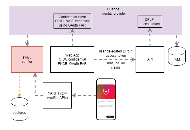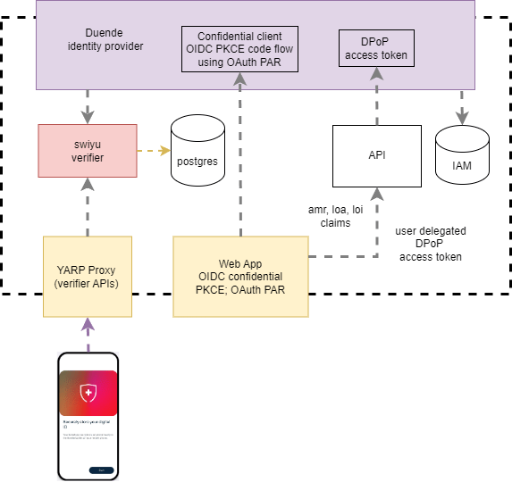 The solution is setup to use an identity provider implemented using ASP.NET Core and Duende, a web application which authenticates using OpenID Connect from the IDP and an API which requires DPoP tokens for access. The swiyu generic container is only accessible in the internal network and the management APIs are not public. The YARP proxy is used for the external endpoints of the public beta generic container. Inside the internal network, the management APIs are fully open without protection. In a follow up post, the APIs can be secured using application security. Network security is not enough for this type of application. a zero trust strategy is required.