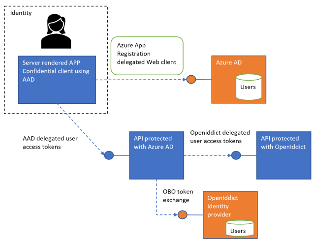 This article shows how to implement the On Behalf Of flow between two APIs, one using Azure AD to authorize the HTTP requests and a second API protected using OpenIddict. The Azure AD protected API uses the On Behalf Of flow (OBO) to get a new OpenIddict delegated access token using the AAD delegated access […]